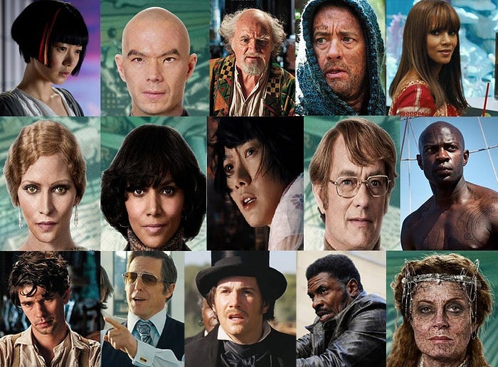 Por falar nelas, apesar de condensar seis tramas diferentes, Cloud Atlas faz com que personagens mantenham um papel específico ao longo das inúmeras histórias, sendo o de questionar a ordem estabelecida ou o de mantê-la. Alguns deles vão mudando de atuação progressivamente (como é o caso das personagens construídas por Tom Hanks), sugerindo assim uma interpretação cósmica e metafísica que procurarei não adotar como foco desta análise.
